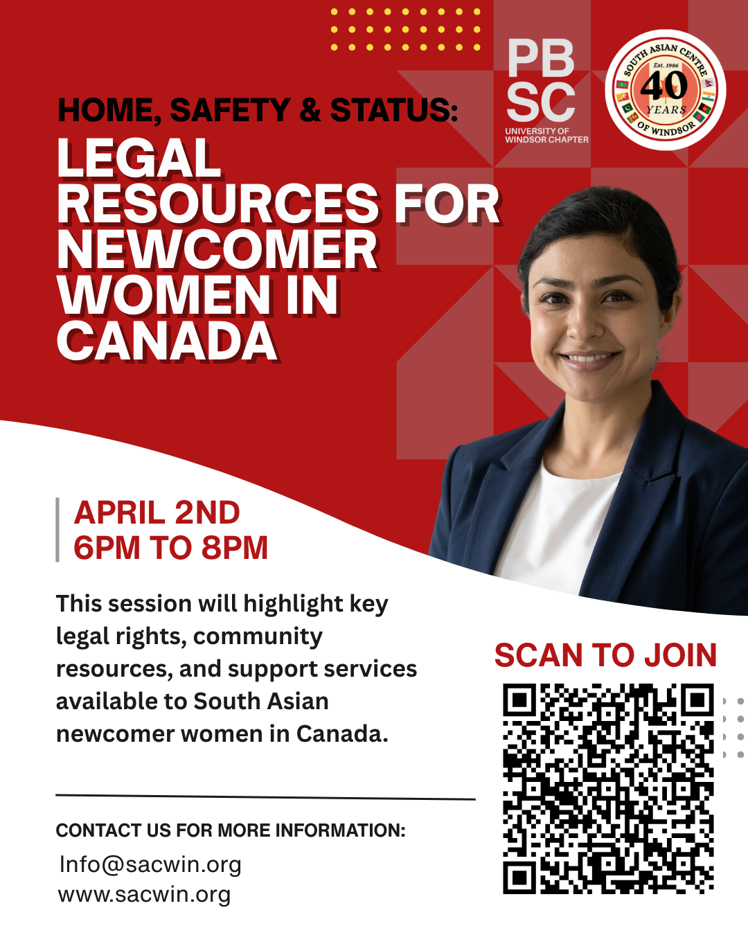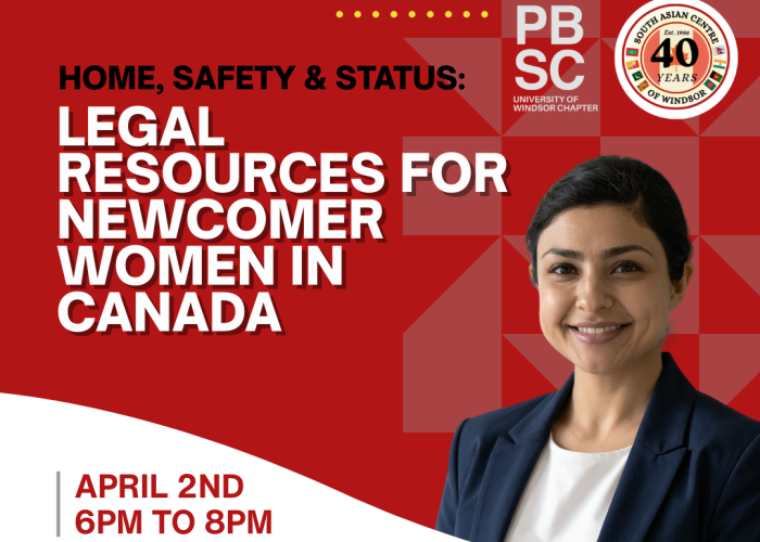 Join us for Home, Safety & Status: Legal Resources for South Asian Newcomer Women in Canada, an informative session designed to help newcomer women better understand their legal rights and available supports. This session will highlight key topics related to housing, personal safety, immigration status, and community resources, while connecting participants with trusted legal information and support services.