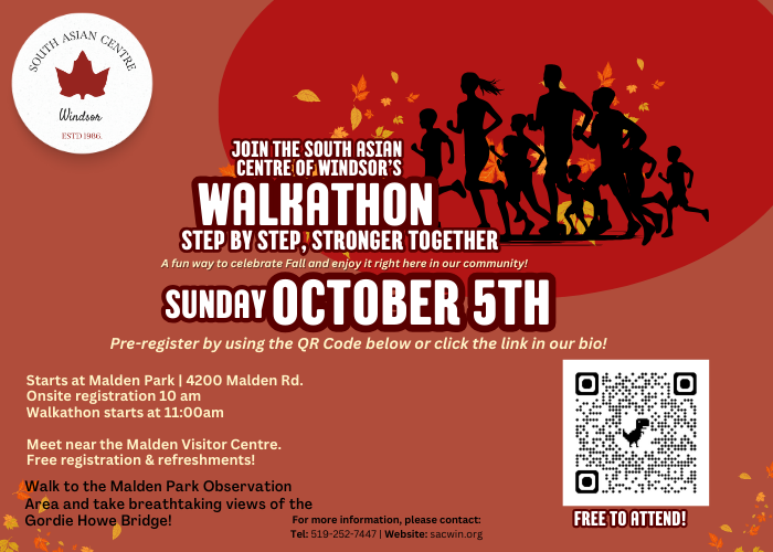Join the South Asian Centre of Windsor for our FREE Walkathon on Sunday, October 5th at Malden Park.